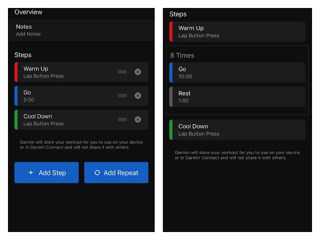 You will then have a template for creating a workout on your screen (screenshot #5 below). Each step can be edited by pressing on the step, this allows you to set the interval for time, distance, HR goal, calories or so that you can end it manually by pressing the lap button, useful for warm-up and cool-down. Each Interval can be moved within the workout by pressing and holding the three horizontal lines, repeats can be nested and you can have multiple repeats within one repeat. It is a very flexible tool allowing you to programme exactly what your coach wants you to do.
